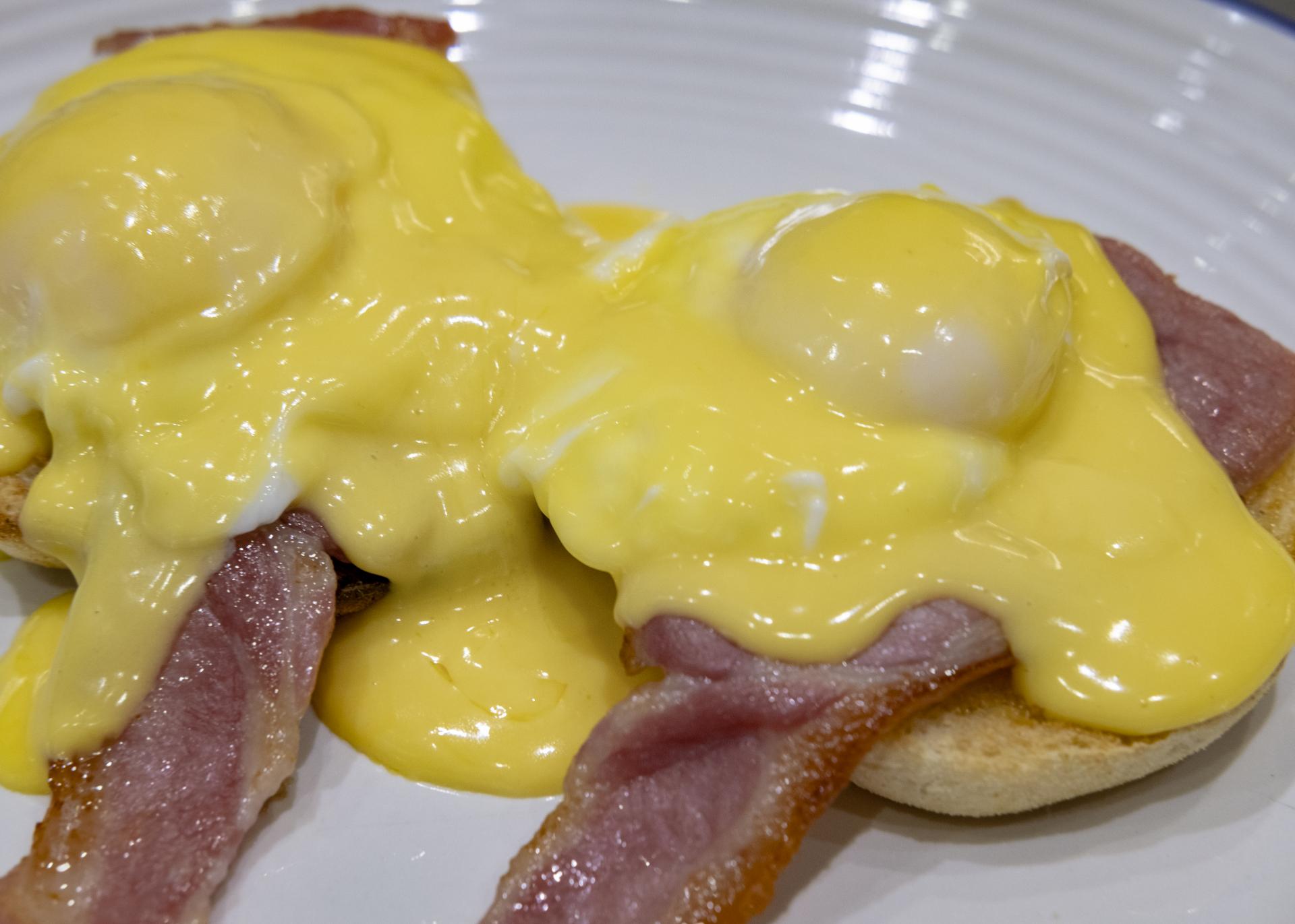 One or Two Poached Eggs with dry-cured back bacon on a muffin topped with Hollandaise Sauce